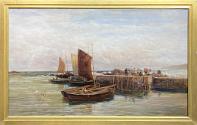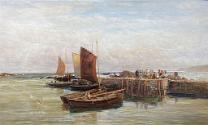 Harbor Scene with Boats Docked and Fisherman Unloading Catch